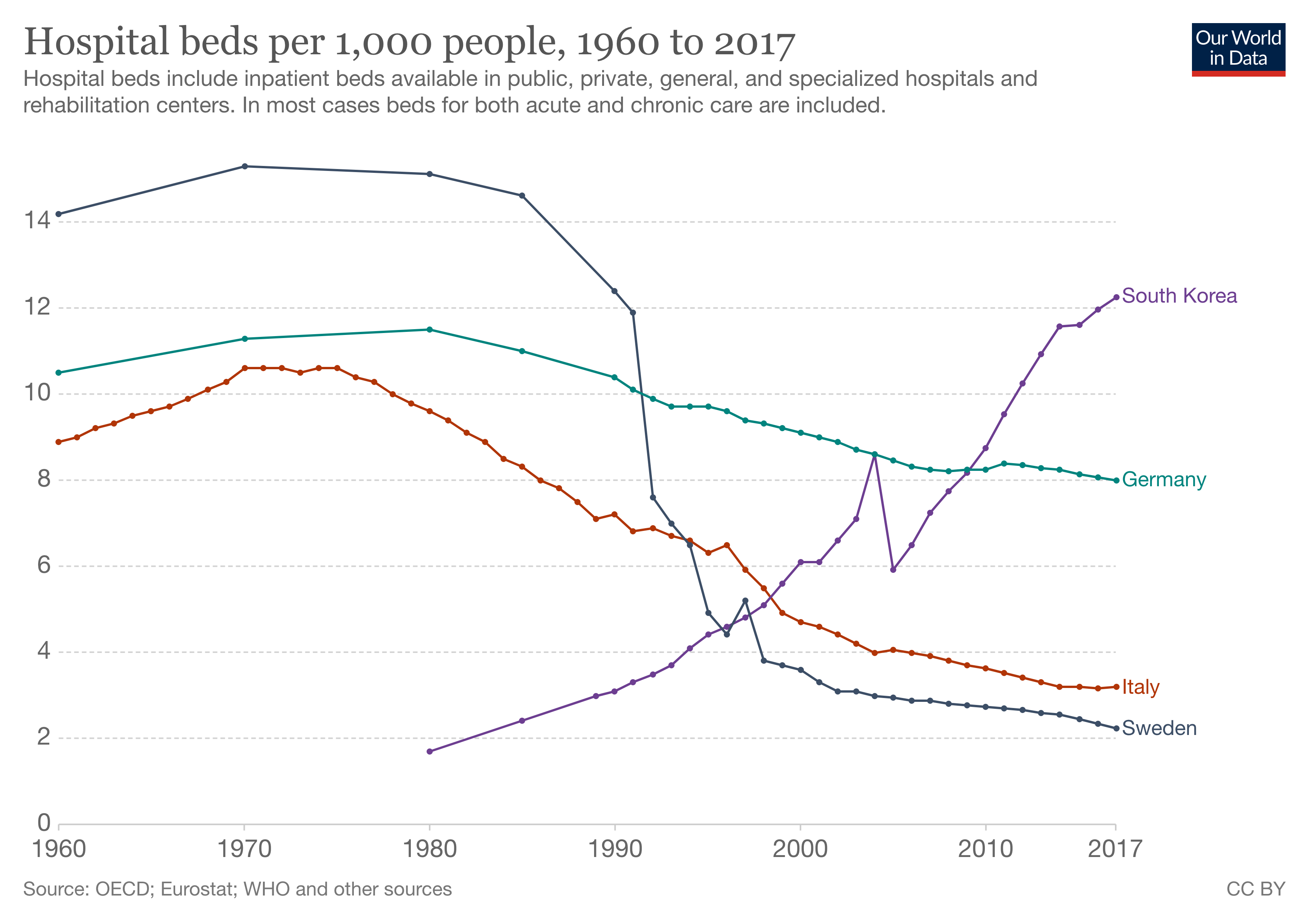 Tu Conte, per primo: avresti dovuto capire che l’emergenza richiedeva un competente alla Salute, non uno buono solo a parlare coi sindacati. Ma come potevi capire, tu, che, come una fattucchiera, vuoi combattere il virus imponendo non più di 6 a tavola o altri simili esorcismi. Ora ti faccio vedere, nel corso degli anni, i posti-letto d’ospedale di Italia, Svezia, Sud Corea e Germania. Ti squilla qualcosa nel cervello? No? Credo sia inutile. Non ci arrivi…