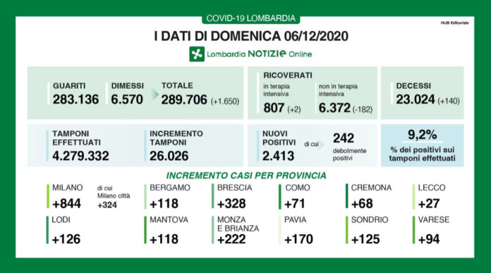 I nuovi casi di positività in Lombardia sono stati 2.413 di cui 242 ‘debolmente positivi’, a fronte di 26.026 tamponi effettuati, per un rapporto del 9.2%. Si sono registrati 140 nuovi decessi.