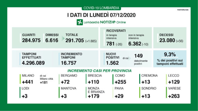 I nuovi casi di positività in Lombardia sono stati 1.562 di cui 149 ‘debolmente positivi’, a fronte però di un numero di 16.757 tamponi decisamente inferiore (16.757), per un rapporto del 9,3% . Si sono registrati 56 nuovi decessi.
