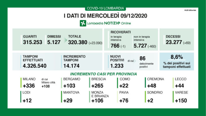 I nuovi casi di positività al coronavirus in Lombardia sono stati 1.233 (di cui 86 ‘debolmente positivi’), a fronte di 14.174 tamponi effettuati per un rapporto dell’8,6% . Si sono registrati 69 nuovi decessi.