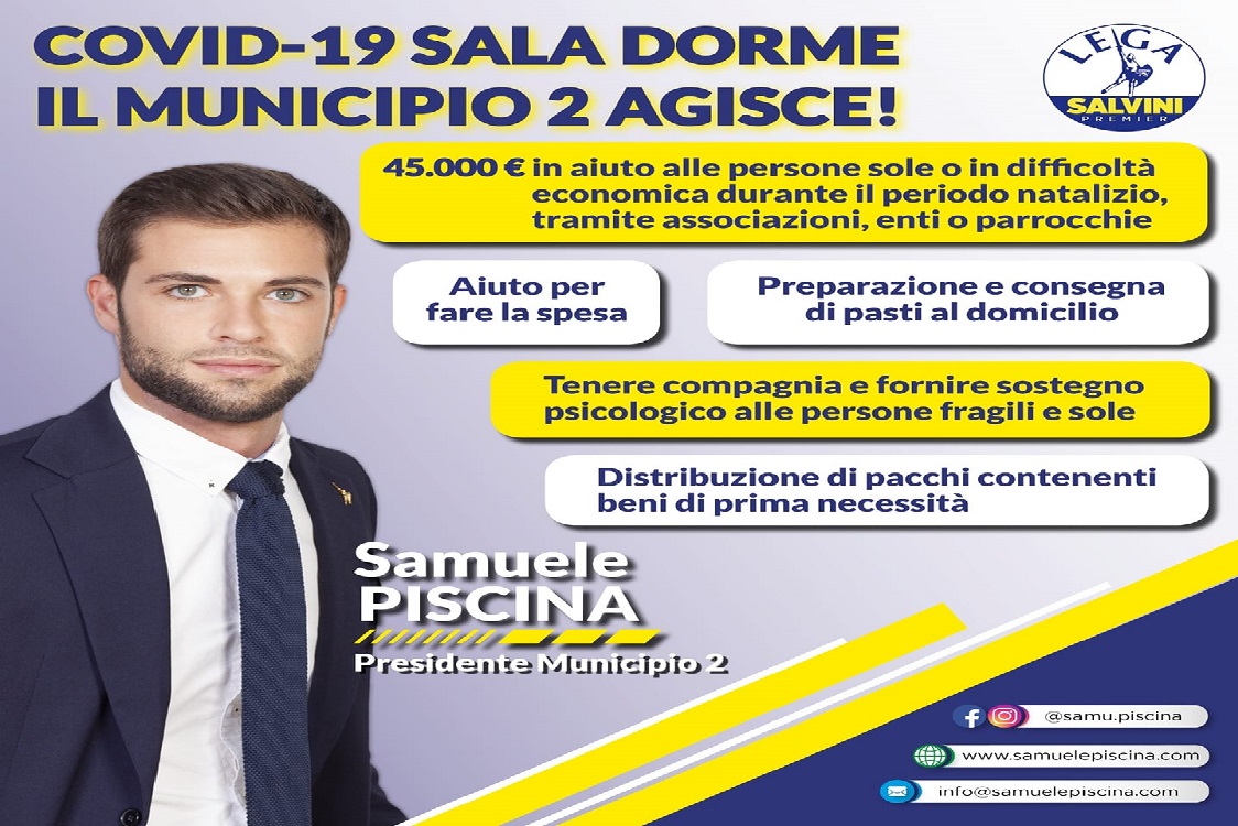 “Dal momento che Sala e la sua Giunta, con la collaborazione della premiata ditta Conte/Di Maio/Zingaretti, se ne fregano bellamente di chi trascorrerà un Natale in solitudine e difficoltà”, dichiara Samuele Piscina, Presidente municipale leghista, “il Municipio 2 promuove un bando per alleviare queste situazioni, sempre più frequenti nella nostra città”. “Mettiamo a disposizione ulteriori 45.000 € del nostro povero bilancio, destinandoli alle associazioni che operano nel sociale, parrocchie ed enti benefici, per supportare chi è più in crisi in questo fine 2020 caratterizzato, purtroppo, dalla seconda ondata del contagio da CoViD-19. Il bando del Municipio 2 prevede fino a 5000 euro a progetto per portare conforto nel periodo natalizio a chi è solo o sta vivendo una situazione economica problematica. Tra le iniziative promosse ci sono, ad esempio, la preparazione e consegna di pasti al domicilio, la distribuzione di pacchi contenenti beni di prima necessità, l’aiuto per fare la spesa o semplicemente tenere compagnia e fornire sostegno psicologico alle persone fragili e sole”.