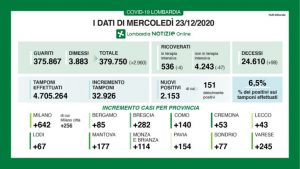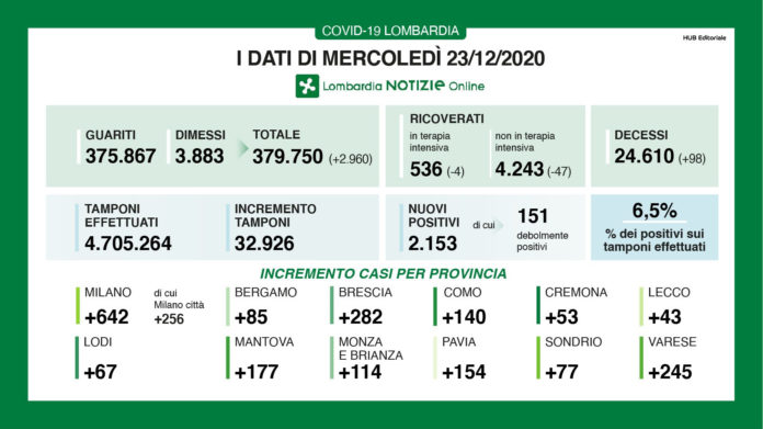 I nuovi casi di positività in Lombardia sono stati 2.153 di cui 151 ‘debolmente positivi’, a fronte di 32.926 tamponi effettuati per un rapporto del 6,5%. Si sono registrati 98 nuovi decessi.