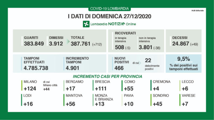 – i guariti/dimessi totale complessivo: 387.761 (+712), di cui 383.849 dimessi e 3.912 guariti