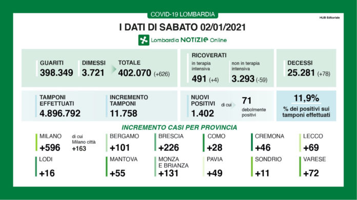 I nuovi casi in Lombardia sono stati 1.402 di cui 71 ‘debolmente positivi’, a fronte di 11.758 tamponi effettuati per un rapporto del 11,9%. Si sono registrati 78 nuovi decessi.
