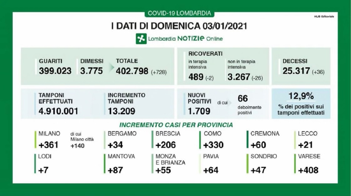 In Lombardia i nuovi casi positivi al Covid-19 sono stati 1.709  (di cui 66 ‘debolmente positivi’) a fronte di 13.209 tamponi, per un rapporto del 12,9 per cento.