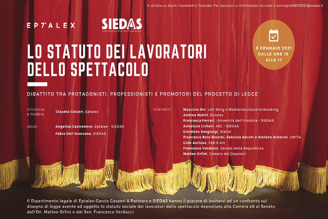 Si terrà online oggi 8 gennaio, dalle ore 15.00 alle ore 17.00, il convegno dal titolo “Lo statuto dei lavoratori dello spettacolo”, organizzato dal dipartimento legale di Eptalex-Garzia Gasperi & Partners e da SIEDAS, Società Italiana Esperti di Diritto delle Arti e dello Spettacolo. Il confronto, che vedrà la partecipazione di esponenti del diritto e del mondo dello spettacolo, vuole concentrarsi sul disegno di legge avente ad oggetto lo statuto sociale dei lavoratori dello spettacolo, depositato alla Camera ed al Senato rispettivamente dall’Onorevole Matteo Orfini e dal Senatore Francesco Verducci. I saluti saranno affidati ad Angelisa Castronovo, avvocato di Eptalex e Socia Esperta SIEDAS e a Fabio Dell’Aversana, avvocato e professore della Scuola Superiore Meridionale – Università degli Studi di Napoli e Presidente SIEDAS. Introduce e modera Claudia Caluori, avvocato di Eptalex. Interverranno Maurizio Roi, Presidente Left Wing e Mediartecultura-artbooking; Andrea Nobili, avvocato giuslavorista e of-counsel di Eptalex; Francesca Ferrari, responsabile del dipartimento di proprietà intellettuale di Eptalex, professore associato dell’Università dell’Insubria e Socia Esperta SIEDAS; Annaluce Licheri, consulente legale ASC e Socia Esperta SIEDAS; Giordano Sangiorgi, coordinatore StaGe!; Francesco Bolo Rossini, Fabrizia Sacchi e Stefano Scherini di UNITA; Gino Auriuso, presidente Fed.It.Art.; Senatore Francesco Verducci, Vice Presidente VII Commissione Cultura del Senato della Repubblica; Onorevole Matteo Orfini, Camera dei Deputati. Il dibattito potrà essere seguito in diretta su Zoom e sul canale Youtube e sulla pagina Facebook di SIEDAS. Per iscrizioni e informazioni è possibile inviare una mail all’indirizzo convegno08012021@siedas.it.