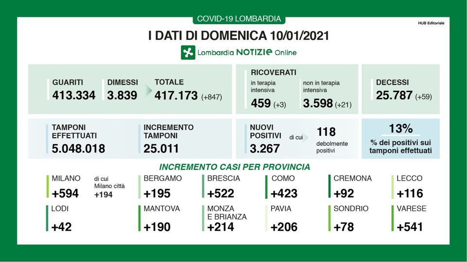In Lombardia a fronte di 25.011 tamponi effettuati sono 3.267 i nuovi positivi, con un rapporto salito al 13%.