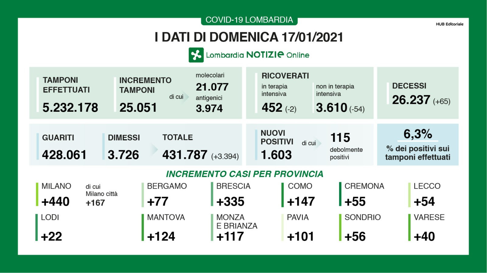 I nuovi casi in Lombardia sono stati 1.603 a fronte di 25.051 tamponi effettuati per un rapporto del 6,3%. Come previsto dalle indicazioni del Ministero della Salute, nella voce dei tamponi è inserito anche il dato dei test antigenici. Si sono registrati 65 nuovi decessi.