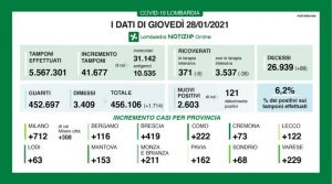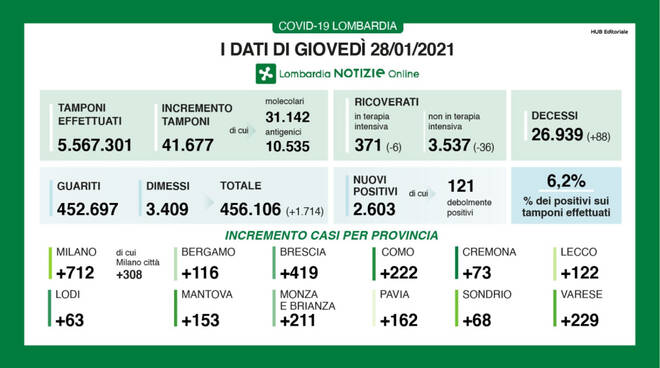I nuovi casi in Lombardia sono stati 2.603 di cui 121 ‘debolmente positivi’ a fronte di 41.677 tamponi effettuati (di cui 31.142 molecolari e 10.535 antigenici) per un rapporto del 6,2%. Si sono registrati 88 nuovi decessi.