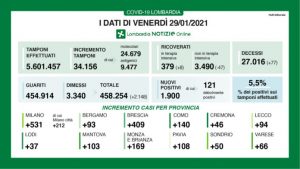 I nuovi casi in Lombardia sono stati 1.900 di cui 121 ‘debolmente positivi’ a fronte di 34.156 (di cui 24.679 molecolari e 9.477 antigenici) tamponi effettuati per un rapporto del 5,5%. Si sono registrati 77 nuovi decessi.