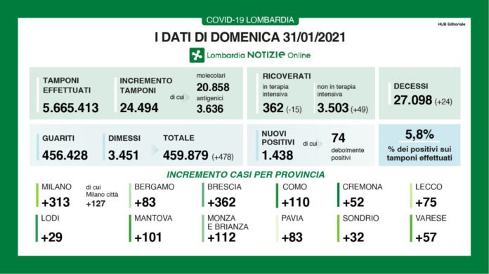 In Lombardia, a fronte di 24.494 tamponi effettuati, sono stati 1.438 i nuovi positivi per un rapporto del 5,8%. I decessi sono stati 24 per un totale complessivo di 27.098.