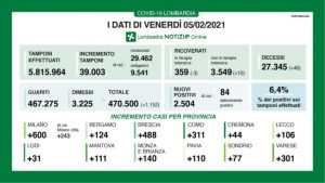 I nuovi casi in Lombardia sono stati 2.504 di cui 84 ‘debolmente positivi’ a fronte di 39.003 tamponi effettuati (di cui 29.462 molecolari e 9.541 antigenici) per un rapporto del 6,4%. Si sono registrati 46 nuovi decessi.