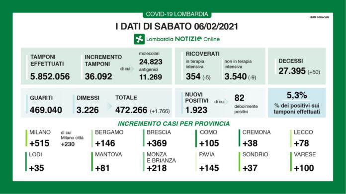 I nuovi casi in Lombardia sono stati 1.923 di cui 82 ‘debolmente positivi’ a fronte di 36.092 tamponi effettuati (di cui 24.823 molecolari e 11.269 antigenici) per un rapporto del 6,4%. Si sono registrati 50 nuovi decessi.