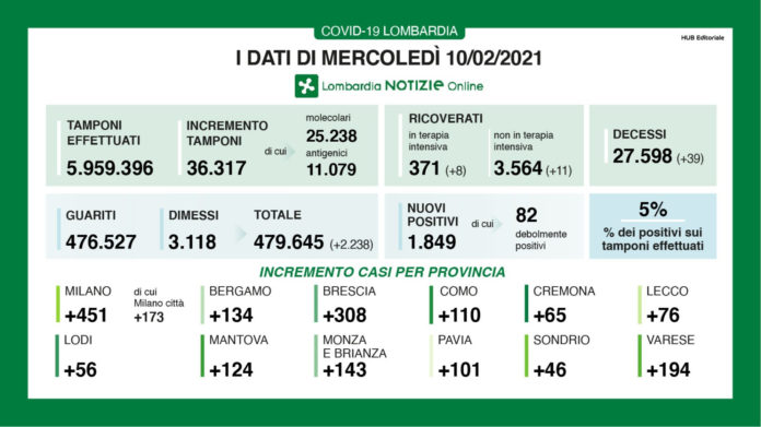 I nuovi casi di positività in Lombardia sono 1.849 di cui 82 ‘debolmente positivi’ a fronte di 36.317 tamponi effettuati, di cui 25.238 molecolari e 11.079 antigenici, per un rapporto del 5%. Si sono registrati 39 nuovi decessi.