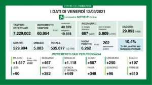 I nuovi casi in Lombardia sono stati 6.262 (di cui 202 ‘debolmente positivi’) a fronte di 60.954 tamponi (di cui 40.976 molecolari e 19.978 antigenici), per un rapporto del 10,2%.