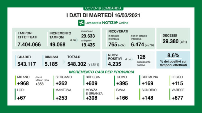 – I nuovi casi di positività al coronavirus in Lombardia sono stati 4.235 (di cui 126 ‘debolmente positivi’) a fronte di 49.068 tamponi effettuati (di cui 29.633 molecolari e 19.435 antigenici), per un rapporto dell’8,6%. Si sono registrati 81 nuovi decessi.