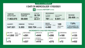 I nuovi casi in Lombardia sono stati 4.490 (di cui 120 ‘debolmente positivi’) a fronte di 59.009 tamponi effettuati (di cui 38.792 molecolari e 20.217 antigenici), per un rapporto del 7,6%. Si sono registrati 79 nuovi decessi.