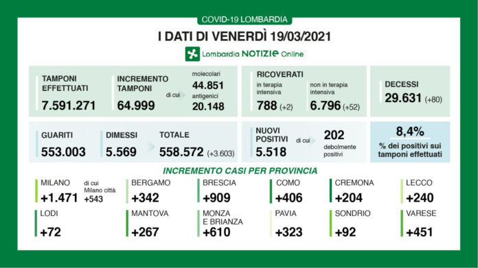 I nuovi casi di positività al coronavirus in Lombardia sono stati 5.518 (di cui 202 ‘debolmente positivi’) a fronte di 64.999 tamponi effettuati ((di cui 44.851 molecolari e 20.148 antigenici) per un rapporto dell’8,4 %. Si sono registrati 80 nuovi decessi.