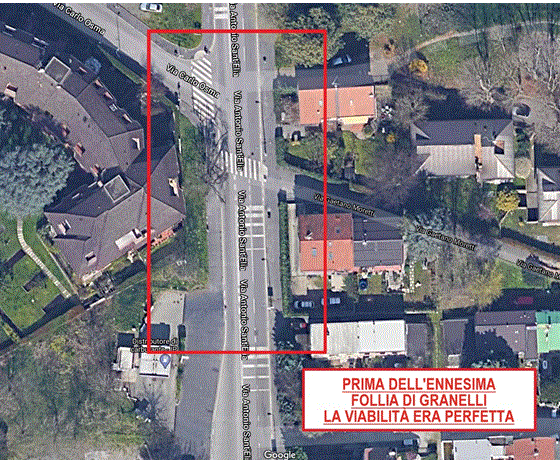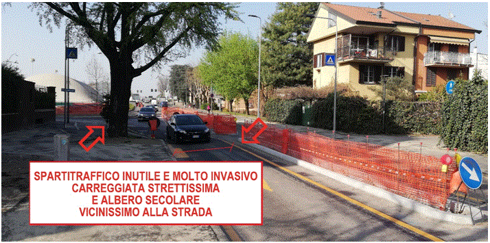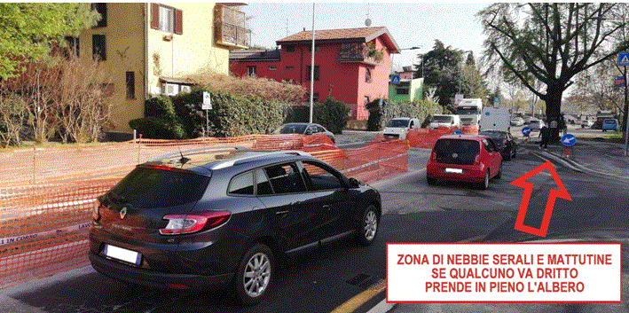 Questo scellerato intervento sembra voler far solo perdere tempo a chi entra ed esce da Milano e in più sembra si voglia cercare la disgrazia a tutti i costi, perché in questa zona ci sono frequenti nebbie mattutine e serali e se qualcuno per un qualsiasi motivo uscisse di strada in quella strozzatura rischierebbe di schiantarsi contro quel grosso albero.