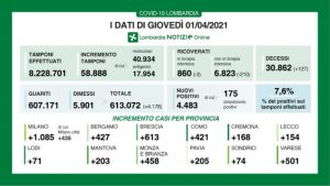I nuovi casi in Lombardia sono stati 4.483 (di cui 175 ‘debolmente positivi’) a fronte di 58.888 tamponi (di cui 40.934 molecolari e 17.954 antigenici) per un rapporto del 7,6%. Si sono registrati 127 nuovi decessi.