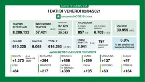 I nuovi casi in Lombardia sono stati 3.941 (di cui 197 ‘debolmente positivi’) a fronte di 57.421 tamponi effettuati (di cui 37.409 molecolari e 20.012 antigenici) per un rapporto del 6,8%. Si sono registrati 97 nuovi decessi.