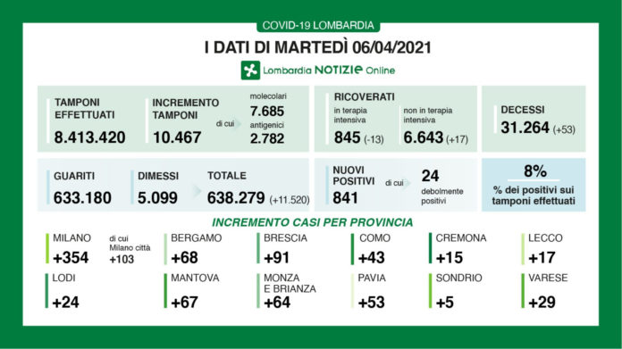 I nuovi casi in Lombardia sono stati 841 (di cui 24 ‘debolmente positivi’) a fronte di 10.467 tamponi (di cui 7.685 molecolari e 2.782 antigenici) per un rapporto del 6,8%. Si sono registrati 53 nuovi decessi.
