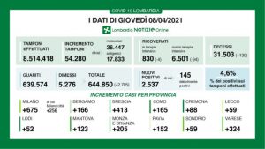 I nuovi guariti/dimessi da mercoledì sono stati 2.705, mentre le persone in terapia intensiva sono 830 (-4). Sono 6.501 i pazienti attualmente ricoverati non in terapia intensiva, 94 in meno di mercoledì.