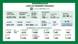 I nuovi casi  in Lombardia sono stati 2.431 (di cui 131 ‘debolmente positivi’ a fronte di 47.103 tamponi (di cui 30.057 molecolari e 17.046 antigenici) per un rapporto del 5,1%. Si sono registrati 87 nuovi decessi.