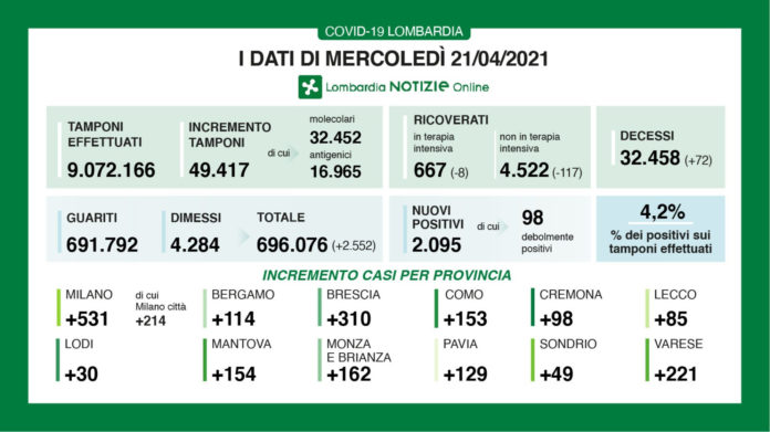 I nuovi casi in Lombardia sono stati 2.095 (di cui 98 ‘debolmente positivi’) a fronte di 49.417 tamponi (di cui 32.452 molecolari e 16.965 antigenici) per un rapporto del 4,2%. Si sono registrati 72 nuovi decessi.