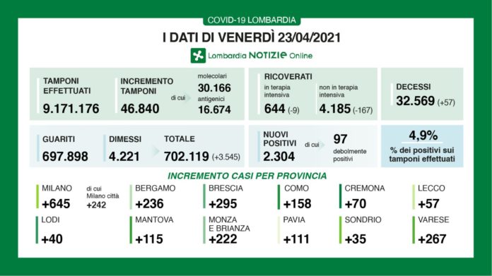 I nuovi casi in Lombardia sono stati 2.304 (di cui 97 ‘debolmente positivi’) a fronte di 46.840 tamponi (di cui 30.166 molecolari e 16.674 antigenici) per un rapporto del 4,9%. Si sono registrati 57 nuovi decessi.