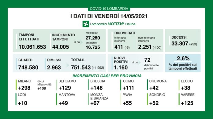 I nuovi casi in Lombardia sono stati 1.160 (di cui 72 ‘debolmente positivi’) a fronte di 44.005 tamponi (di cui 27.280 molecolari e 16.725 antigenici) per un rapporto del 2,6%. Si sono registrati 23 nuovi decessi.