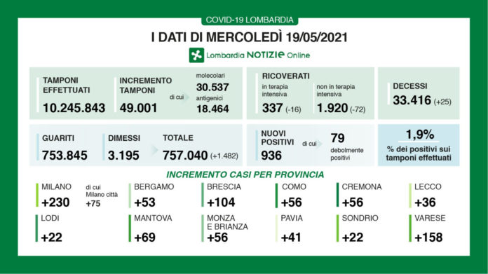 I nuovi casi in Lombardia sono stati 936 (di cui 79 ‘debolmente positivi’) a fronte di 49.001 tamponi effettuati (di cui 30.537 molecolari e 18.464 antigenici) per un rapporto del 1,8%. Si sono registrati 25 nuovi decessi.