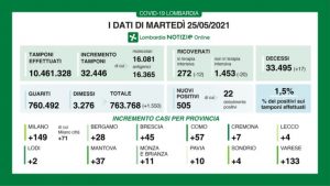 – I nuovi casi in Lombardia sono stati 505 (di cui 22 ‘debolmente positivi’) a fronte di 32.446 tamponi effettuati (di cui 16.081 molecolari e 16.365 antigenici) per un rapporto del 1,5%. Si sono registrati 17 nuovi decessi.