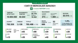 I nuovi casi in Lombardia sono stati 666 (di cui 52 ‘debolmente positivi’) a fronte di 42.222 (di cui 25.770 molecolari e 16.452 antigenici) per un rapporto dell’ 1,5%. Si sono registrati 15 nuovi decessi.