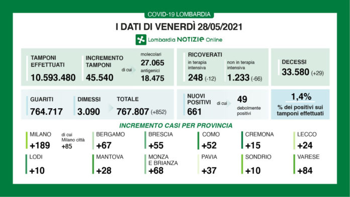 I nuovi casi in Lombardia sono stati 661 (di cui 49 ‘debolmente positivi’) a fronte di 45.540 tamponi (di cui 27.065 molecolari e 18.475 antigenici) per un rapporto dell’ 1,4%. Si sono registrati 29 nuovi decessi.