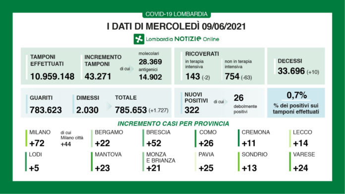 I nuovi casi di positività al coronavirus in Lombardia sono 291 (di cui 26 ‘debolmente positivi’) a fronte di 43.271 (di cui 28.369 molecolari e 14.902 antigenici) per un rapporto dello 0,7%. Si sono registrati 10 nuovi decessi.