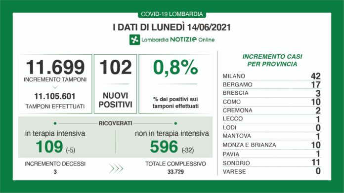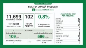 I nuovi casi in Lombardia sono stati 102 a fronte di 11.699 tamponi per un rapporto dello 0,8%. Si sono registrati 3 nuovi decessi.