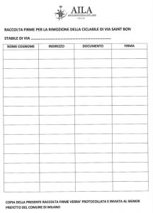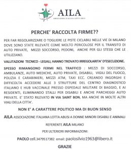 Sono il Referente per Milano di Aila Associazione italiana Lotta Abusi di Ada Orsatti. Scrivo a seguito di quanto letto su un vostro articolo sulla ciclabile pericolosa di Corso Buenos Aires segnalata da Taxiblu.
