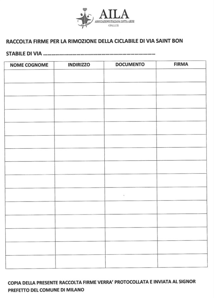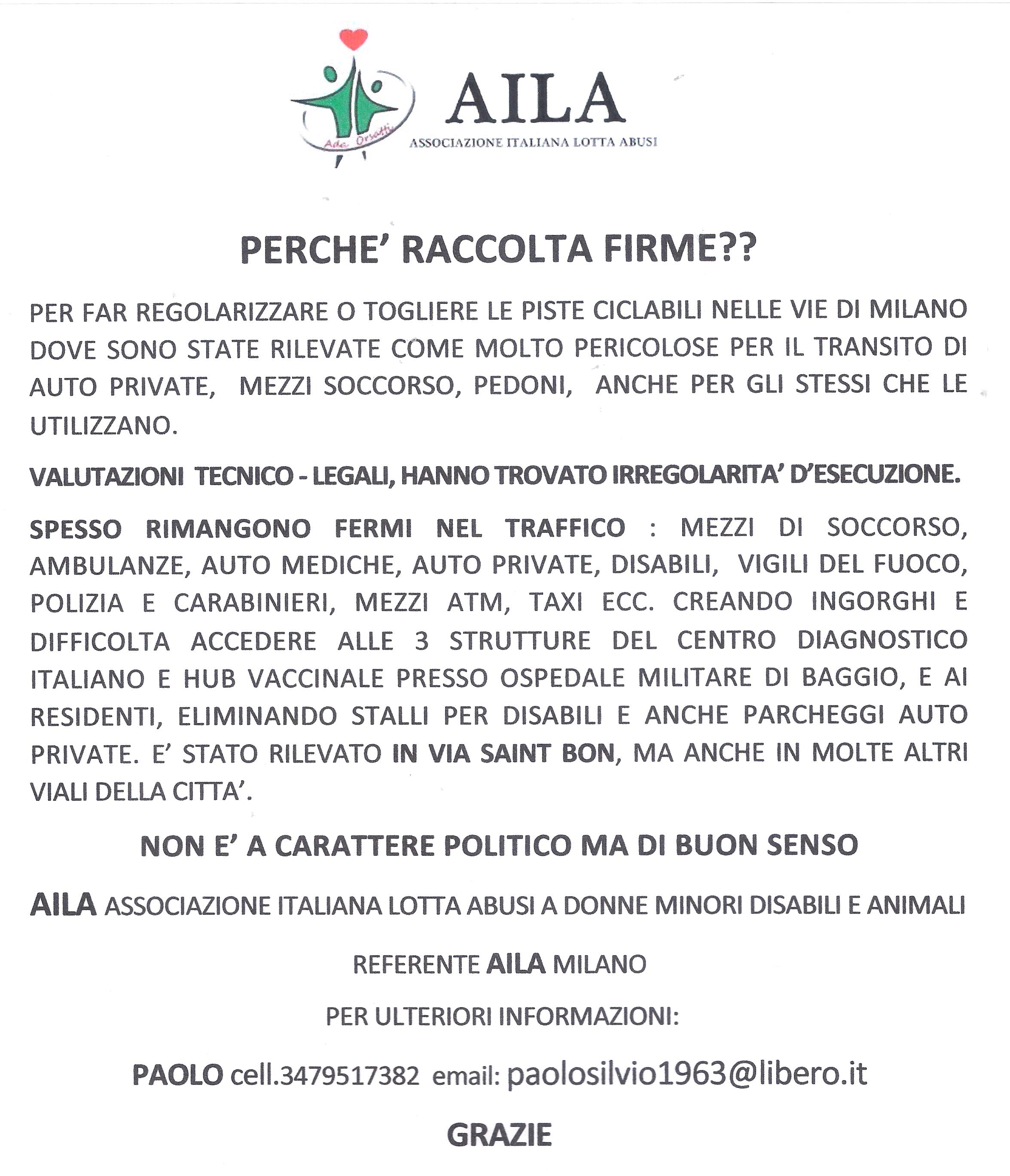 Sono il Referente per Milano di Aila Associazione italiana Lotta Abusi di Ada Orsatti. Scrivo a seguito di quanto letto su un vostro articolo sulla ciclabile pericolosa di Corso Buenos Aires segnalata da Taxiblu.