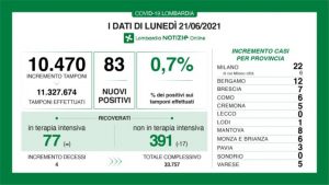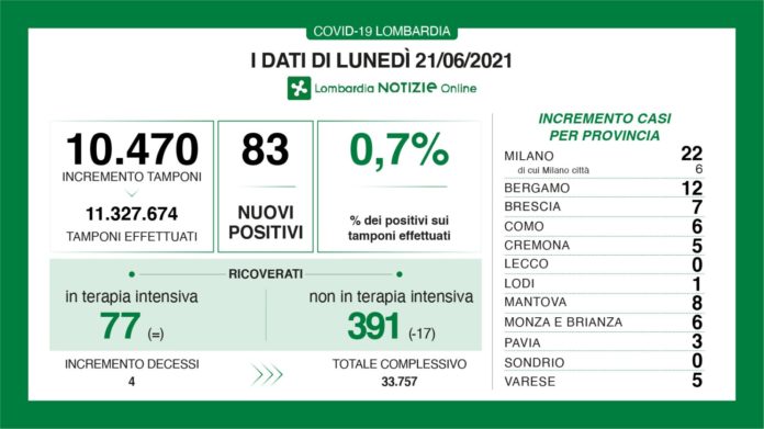 I nuovi casi di positività in Lombardia sono stati 83 a fronte di 10.470 tamponi per un rapporto dello 0,7%. Si sono registrati 4 nuovi decessi.