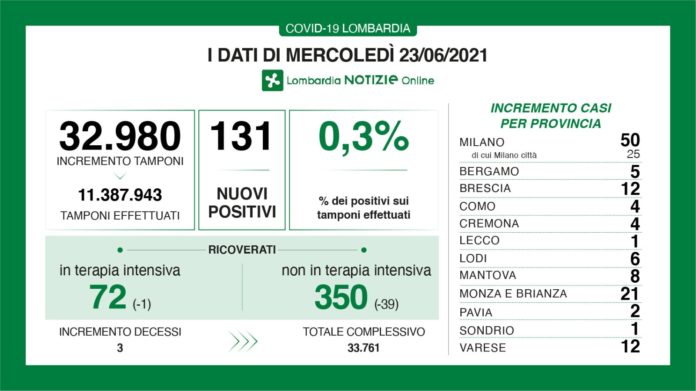 I nuovi casi in Lombardia sono stati 131 a fronte di 32.980 tamponi per un rapporto dello 0,3%. Si sono registrati 3 nuovi decessi.