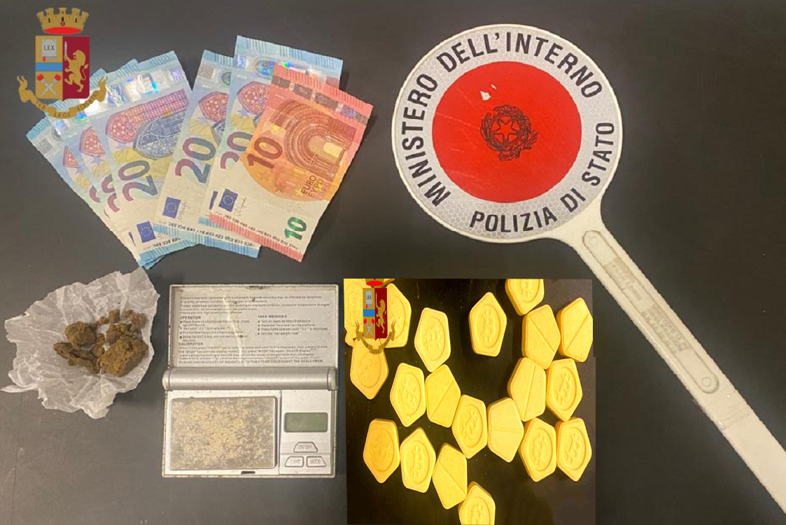 La Polizia di Stato ha arrestato un ragazzo italiano di 20 anni, con precedenti penali, per il reato di detenzione e spaccio di pastiglie di anfetamina e hashish.