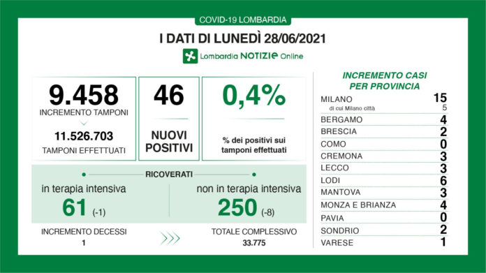 I nuovi casi in Lombardia sono stati 46 a fronte di 9.458 tamponi per un rapporto dello 0,4%. Si registra è registrato 1 nuovo decesso.