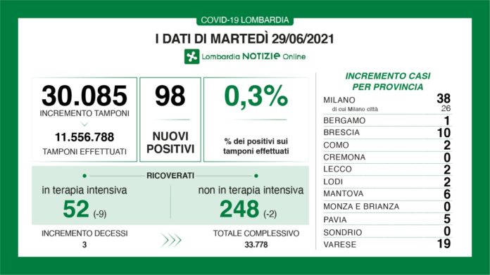 I nuovi casi di positività al coronavirus in Lombardia sono stati 98 a fronte di 30.085 tamponi per un rapporto dello 0,3%. Si registrano 3 nuovi decessi.