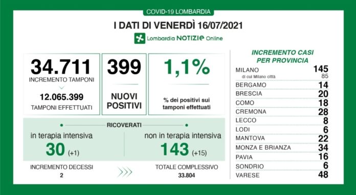 Nelle  altre province i nuovi casi registrati sono stati 48 a Varese, 30 a Cremona, 29 in quella di Brescia, 27 nella provincia di Monza e Brianza, 24 a Bergamo, 20 a Como, 19 a Mantova, 17 a Pavia, 15 a Lodi, 3 a Sondrio, 1 a Lecco.