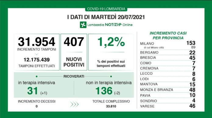 I nuovi casi in Lombardia sono stati 407 a fronte di 31.954 tamponi per un rapporto dell’1,2%. Non si sono registrati nuovi decessi.