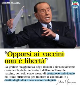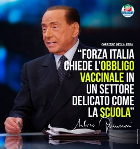 Per questo molto opportunamente Forza Italia chiede l’obbligo vaccinale in un settore delicato come la scuola, nel quale potrebbe essere in pericolo la possibilità stessa della ripresa della didattica in presenza, fondamentale per il processo formativo dei nostri ragazzi. Sui vaccini insomma sono necessari senso di responsabilità, unità nazionale, nessuna strumentalizzazione politica. Altrimenti rischiamo di spegnere la luce che comincia a vedersi in fondo al tunnel.