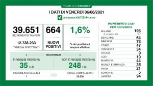 I nuovi casi in Lombardia sono stati 664 a fronte di 39.651 tamponi per un rapporto del 2,2%. Si è registrato un nuovo decesso.