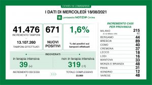 I nuovi casi in Lombardia sono stati 671 a fronte di 41.476 tamponi per un rapporto del 1,6%. Si sono registrati 7 decessi.