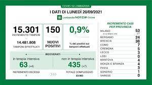 I nuovi casi di positività al coronavirus in Lombardia sono stati 150 a fronte di 15.301 tamponi, per un rapporto dello 0,9%. Si è registrato un nuovo decesso.